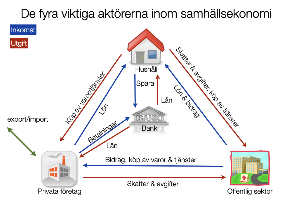 Flera saker påverkar ett lands ekonomi. Flera aktörer i samhället är beroende av varandra. Samhällets ekonomi fungerar ungefär som ett hushålls, men med mycket större belopp. Hög- och lågkonjunkturer påverkar ekonomin på ett positivt eller negativt sätt.